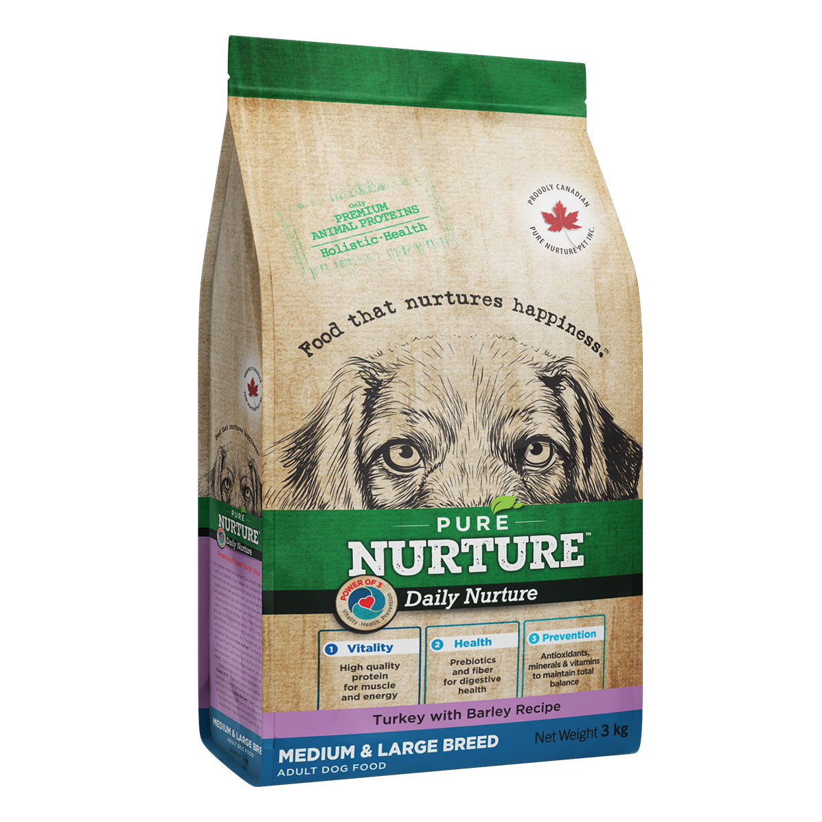 Hrana uscată super-premium Pure Nurture Adult cu curcan și orz (3kg) pentru câini de talie medie/mare. Oferă energie echilibrată, digestie sănătoasă și imunitate prin 30% curcan proaspăt, omega 3/6, glucozamină & condroitină. Holistică, fără suplimente!