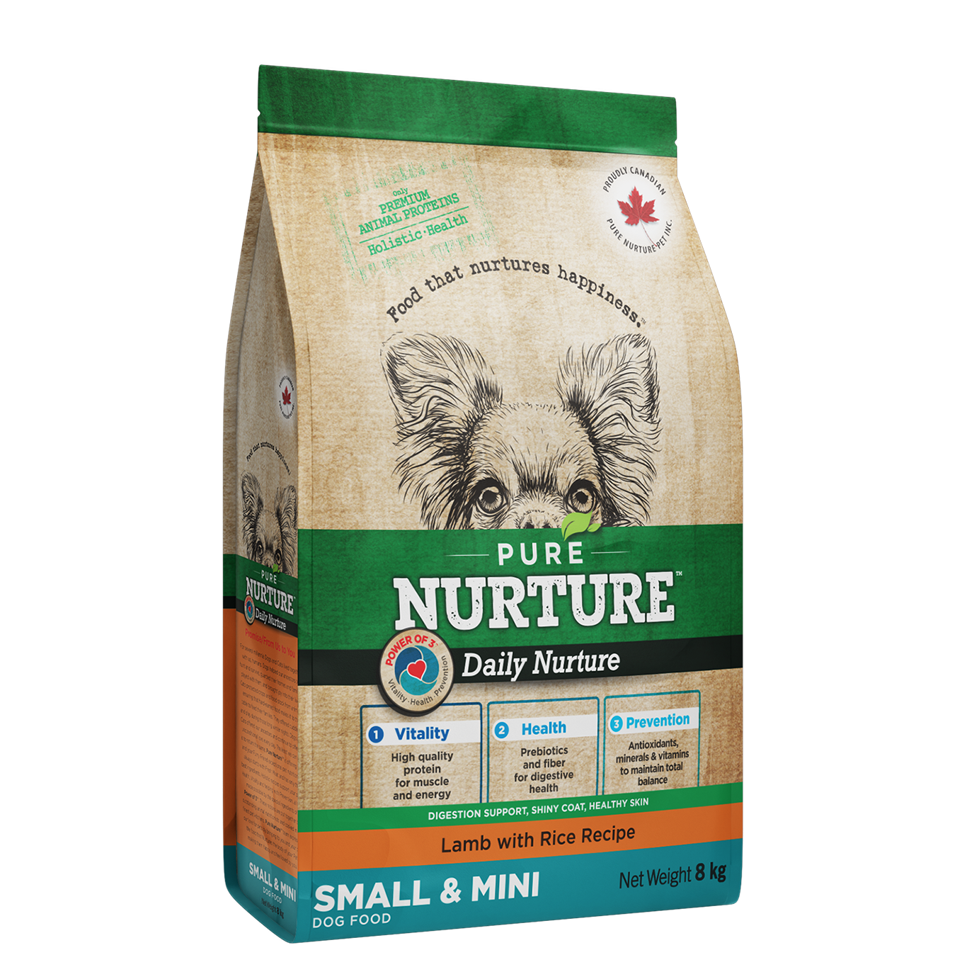 Pure Nurture Daily Lamb with Rice Small & Mini Adult este o hrană holistică completă, uscată, cu miel și orez, pentru câini de talie mică, cu stomac, piele și blană sensibile. Dieta Daily Nurture este concepută conform principiului holistic al nutriției și ajută la menținerea unei digestii stabile, a unei pielii sănătoase și a unei blăni strălucitoare. Formula se bazează pe proteine din miel ușor digerabile și conține complexul brevetat Power of 3 – o combinație de proteine animale, prebiotice și un echilibru vitamino-minerale.