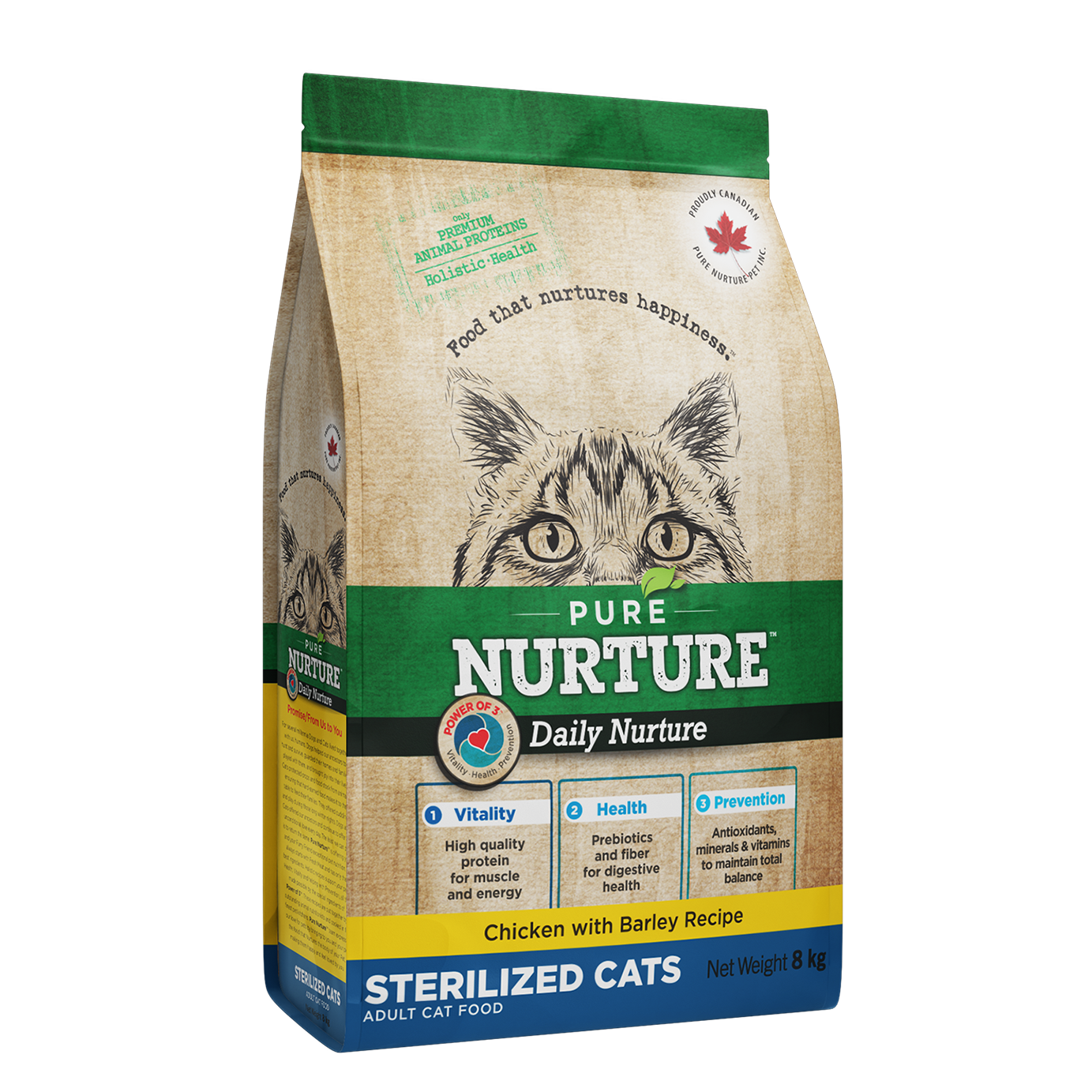Hrana uscată completă Pure Nurture cu pui și orz pentru pisici sterilizate este o nutriție holistică special formulată pentru a susține greutatea optimă, sănătatea urinară și nivelurile de activitate după sterilizare. Formula Daily Nurture combină proteine animale de înaltă calitate, cereale integrale și complexul caracteristic Power of 3 , oferind o nutriție zilnică echilibrată.
