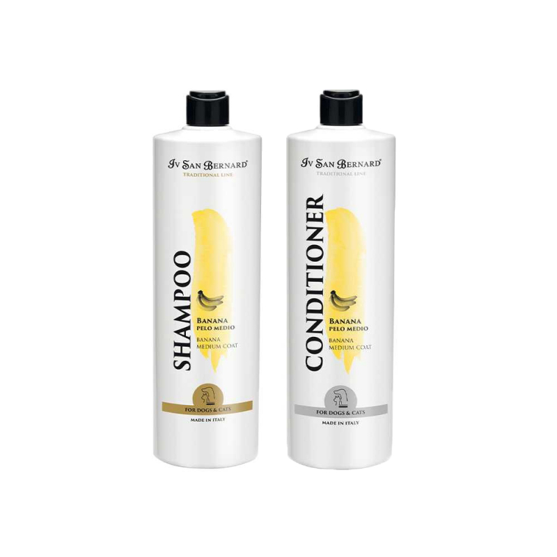 Set Șampon + Balsam Banana ISB emolient pentru pisici/câini cu blană medie! Cu parfum bogat de banană: șamponul (diluat 1:3) face blana moale/suplă/strălucitoare; balsamul hrănește, hidratează, elimină electricitatea statică, facilitează perierea/descărcarea. Utilizare frecventă. Doar uz extern.